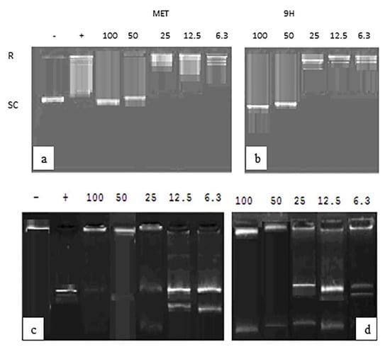 The topoisomearse I and II assay results after incubation with conc 5–100 uM 9H. (a) Supercoiled DNA marker is indicated in lane 1 (-). Lane 2 (+) shows a relaxed DNA marker. Complete activity was seen when no supercoiled DNA substrate remained (last lane) and partial activity with some supercoiled DNA (lane 6) using methotrexate. (b) The 9H compound dose dependent effect on topoisomerase, showing complete inhibition starting from a 50 uM concentration (lane 2) and partial activity at lanes 3 and 4 (25, 12.5 uM, respectively). (c) Lane 1: kDNA catenated DNA marker, lane 2, kDNA digested Xho1, Lane 3 to last lane show kDNA + topo II with different concentrations of methotrexate. (d) 9H compound dose dependent effect on topoisomerase II, showing complete inhibition at doses of 100, 50 uM (lanes 1 and 2) and partial inhibition at lane 3 (25 uM).