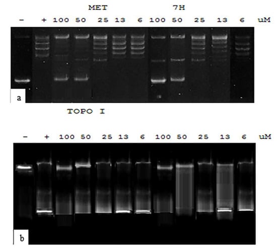 Topoisomearse I and II assay results after incubation with conc 5–100 µM 7H. (a) Supercoiled DNA marker is indicated in lane 1 (−). Lane 2 (+) shows relaxed DNA marker. Complete activity is seen when no supercoiled DNA substrate remains (last lane) and partial activity with some supercoiled DNA (lane 6) using methotrexate. (b) 7H compound dose dependent effect on topoisomerase, showing complete inhibition starting from 50 uM concentration (lane 2) and partial activity at lane 4 (12.5 uM). Lane 1: kDNA catenated DNA marker, lane 2, kDNA digested Xho1, Lane 3 to last lane show kDNA + topo II with different concentrations of methotrexate.