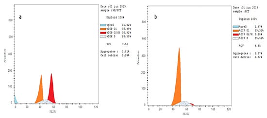 In order to study the effect of TUDHIPPs on the phases of the cell cycle, we analyzed the effect of the IC50 doses of 9H on the HeLA and HCT cells (cells showing highest cytotoxicity) as well as the effect of the IC50 dose of 7H on HCT cells by performing a flow cytometry study. Both 9H and 7H compounds inhibited the cell growth of HCT and HeLa cells by causing cell cycle arrest in the G2/M phase. A noticeable decrease in the percentage of cells in the G0–G1 phase and S-phase and an increased percentage of cells in the G2/M phase and pre-G1 phase compared to the control HCT cells was detected (Table 9, Figure 16 and Figure 17). Furthermore, 9H and 7H markedly increased the percentage of cells undergoing apoptosis compared to the control samples. A noticeable induction of necrosis was also detected (Table 10).