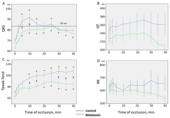 Dynamics of ECG parameters during coronary occlusion in control and melatonin groups (mean ± SEM). (A) QRS interval; note two peaks of QRS prolongation at 5–10th and 25th mins. In the melatonin group, the early phase of QRS prolongation is blunted. 83 ms cut-off point of QRS for VF development. Note that QRS duration does not exceed the cut-off point of 83 ms in the melatonin-treated animals; (B) QT interval; (C) Tpeak-Tend interval; (D) RR interval; *-p < 0.05 differences in respect to baseline state (0 min); §-p < 0.05 differences between control and melatonin groups.