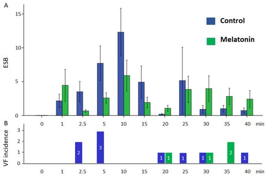 Collectively, our data show that melatonin has a prevalent effect on the parameters of depolarization in the ischemic conditions. In the present study, among the tested ECG indices, only QRS interval was associated with VF incidence. This fact was confirmed by studies performed by our group, which showed that myocardial activation parameters strongly correlated with VF incidence in a porcine model of acute coronary occlusion [,] and were modified by melatonin [,]. In the present study, QRS duration in the melatonin-treated animals who did not develop phase 1A VF did not exceed the cut-off point of 83 ms, which demonstrated the best sensitivity and specificity for association with VF otherwise. Melatonin, however, did not affect the 1B phase VF, which was probably due to the fact that it did not decrease the ESB, which was also associated with VF incidence. These data correspond to our recent findings obtained in a rodent model of ischemia-reperfusion, demonstrating the lack of melatonin effects on the trigger factors []. The triggers of reentry arrhythmias occurrence are related to sympathetic activation [], modification of connexin properties [], and generation of early or delayed afterdepolarizations [,]. It may be speculated that the short-term melatonin treatment in the present experimental model was insufficient to change properties of connexin, APD, or demonstrate sympatholytic effect. Hence, melatonin could not reach the ischemic zone and exclusively affected the perfused myocardium. A preventive melatonin treatment before coronary occlusion may be supposed to lead to electrophysiological effects on ischemic myocardium and have a more pronounced influence on the arrhythmogenic substrate and triggers.