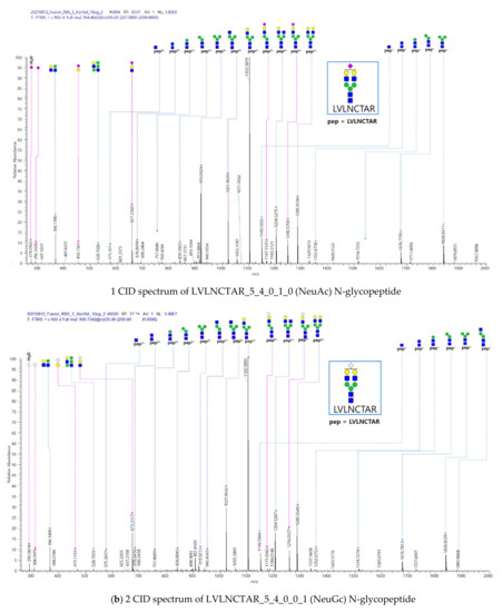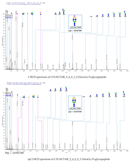 Animal cells, such as Chinese hamster ovary cells (CHO cells), are generally used for producing mAb [23], thus enabling galactose-α-1,3-galactose (α-gal) and N-glycolylneuraminic acid (NeuGc), two non-human glycan structures, to be expressed on mAb [24] at very trace levels. They were negligible because of the anaphylactic responses mediated by anti-α-gal IgE [25] and immune reactions mediated by anti-NeuGc antibodies [26] but were difficult to detect due to their very small level. Here, several N-glycopeptides, including NeuGc glycans identified by I-GPA, were expressed in the VEGFR-1 and -2 domains in three standard samples from Korea, Europe and USA, but not in Fc-IgG domain (Supplementary Table S4). The HCD, CID and EThcD spectra from LVLNCTAR_5_4_0_1_0 (NeuAc) and LVLNCTAR_5_4_0_0_1(NeuGc) identified by I-GPA search are shown in Figure 2 with oxonium ions from HCD, glycan-cleaved glycopeptide fragment ions (B/Y) from HCD and CID, and peptide fragment ions (c/z) from EThcD. The (a)-1, (b)-1, and (c)-1 spectra in Figure 2 contain NeuAc specific oxonium ions (m/z 274.0926 (NeuAc-H2O), 292.1031 (NeuAc), 454.1559 (Hex1NeuAc1), 657.2365 (Hex1HexNAc1NeuAc1)), glycan-cleaved glycopeptide fragment ions (m/z 1167.5120 (Hex3HexNAc3NeuAc1, 2+) and 1248.5358 (Hex4HexNAc3NeuAc1, 2+)) and peptide fragment ions (m/z 1259.9773 (z52+), 1316.5079(z62+) and 1366.0676(z72+) for LVLNCTAR_5_4_0_1_0 (NeuAc)). The (a)-2, (b)-2, and (c)-2 spectra in Figure 2 contains the NeuGc specific oxonium ions (m/z 290.0878 (NeuGc-H2O), 308.0984 (NeuGc), 470.1518 (Hex1NeuGc1), 673.2323 (Hex1HexNAc1NeuGc1)), glycan-cleaved glycopeptide fragment ions (m/z 1175.0062 (Hex3HexNAc3NeuGc1, 2+) and 1256.0327 (Hex4HexNAc3NeuGc1, 2+)) and peptide fragment ions (m/z 1268.1027 (z52+), 1324.5109(z62+) and 1374.0419(z72+)) that were identified for LVLNCTAR_5_4_0_0_1 (NeuGc). The mass difference between NeuAc and NeuGc specific ions is the mass of oxygen.