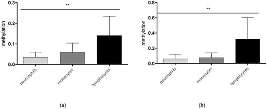 AQP5 promoter methylation in the promoter region nt-145 to nt-49 in different blood cells of healthy controls (a) and septic patients (b). Neutrophils, monocytes, and lymphocytes were isolated using magnetic separation, DNA extraction, bisulfite conversion and methylation-specific PCR for the promoter region from nt-49 to nt-145. AQP5 promoter methylation was significantly different between the immune cells analyzed in healthy controls ((a) p = 0.0039, n = 10) and septic patients ((b) p = 0.0041, n = 10), (** p ≤ 0.01).