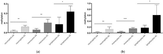 Sufficient immunity is a basis for coping with infectious diseases. However, an excessive immune response to an inflammatory stimulus might lead to additional harm as expected in sepsis [] or acute respiratory distress syndrome []. Such a serious medical state is characterized by high mortality, despite intense research and medical treatment efforts []. Moreover, a wide variability exists regarding the outcomes, and this may be co-induced by genetic diversity [,]. A potential candidate gene for the investigation of genetic differences is the gene encoding aquaporin (AQP) 5 [], which mediates key mechanisms of inflammation that prevail in sepsis and acute respiratory distress syndrome, including cell migration and proliferation [], activity of the renin-angiotensin-aldosterone system [], and the transmembrane transport of water []. We described a functional single nucleotide (-1364A/C, rs3759129) polymorphism in the AQP5 gene promoter previously []. The C-allele (CC and AC) of this polymorphism occurs in around 28% of all individuals (Hardy-Weinberg-equilibrium) []. The substitution of C for A at position-1364 was associated with decreased AQP5 mRNA and AQP5 protein expression and decreased neutrophil migration [] which we ascribe to different water-influx followed by aberrant formation of lamellipodia. We expect that the impact on immune cell migration is the key for being an independent prognostic factor for decreased 30-day mortality in patients with sepsis with a hazard ratio of nearly 4 for the AC/CC genotypes compared with the homozygous AA genotype []. Accordingly, these results suggest a protective impact of a lower AQP5 expression in sepsis [], and mechanisms linked to an altered AQP5 expression are of great interest. However, the underlying molecular and pathophysiological alterations linking a decreased AQP5 expression to the AQP5 (-1364) genotype are still unknown. One possible regulatory mechanism might be a genotype-dependent DNA methylation of the cytosine residue in 5′-cytosine-phosphate-guanine-3′ (CpG) sites, which depicts a frequent epigenetic modification involved in the regulation of gene expression [] and also influences AQP5 expression [,]. We recently described a functionally important AQP5 promoter methylation site (nt-937) linked to the binding of the inflammatorily acting nuclear transcription factor NF-κB, accompanied by increased methylation in sepsis non-survivors []. This demonstrates the potential role of epigenetic changes in AQP5 promoter regions. Furthermore, the higher methylation of the AQP5 promoter diminished reporter gene transcription, whereas demethylation by 5-azacytidine evoked higher AQP5 expression []. Consequently, the AQP5 promoter methylation might be influenced by the AQP5 (-1364A/C) genotype and could be a mechanism influencing AQP5 expression in sepsis. Accordingly, we tested the hypotheses that DNA methylation of the AQP5 promoter is associated with the AQP5 (-1364A/C) genotype. Keeping in mind that the effect of altered migration could be shown in neutrophils, we examined whether this regulation is restricted to special types of immune cells—a question that has, to the best of our knowledge, never been analyzed.