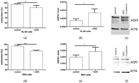 Incubation of proliferating immune cells HL-60 and REH with 50 µM aza-deoxycytosin (ADC) for 72 h. The AQP5 promoter methylation in the promoter region nt-145 to nt-49 in HL-60 ((a) n = 4) and REH cells ((d) n = 4) decreased after ADC incubation. The AQP5 mRNA expression increased in HL-60 ((b) n = 4) and REH cells ((e) n = 4). A similar effect could be detected in the protein expression in HL-60 (c) and REH (f) cells, where a representative bot out of three experiments is shown (* p ≤ 0.05; *** p ≤ 0.001).