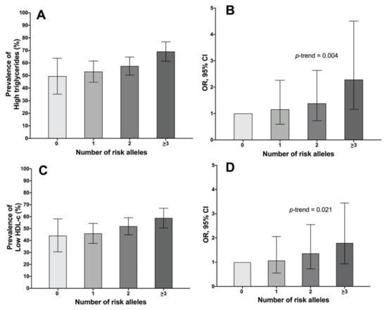 Furthermore, the GRS was associated with an increased prevalence of hypertriglyceridemia and low HDL-c according to the number of risk alleles carried (Figure 1A–D). It is noteworthy that the GRS model with the two MARC1 and ADCY5 SNPs was the one that best showed a significant risk association for HDL-c (OR = 3.44, p = 0.018) (Table 3).