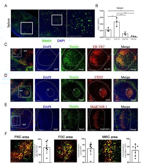 Characterization of Nestin expression in the spleen: (A) Nestin (green) expression in the spleens of Nes-GFP transgenic mice. Nuclei were counterstained with DAPI (blue). Scale bar, 100 µm; (B) qRT-PCR analysis of Nestin gene expression in the spleen of normal mice on days 7, 14, 28, 90 after birth. The relative mRNA expression levels of Nestin were normalized to reference GAPDH controls. n = 3. (C–E) Immunohistochemical analyses showed that the Nes-GFP+ cells in the spleen expressed markers of FRCs, FDCs, and MRCs; (C) ER-TR7 (FRCs); (D) CD35 (FDCs); (E) MadCAM-1 (MRCs). Nuclei were counterstained with DAPI (blue). Scale bar, 50 µm. White Pulp, WP; Germinal Center, GC; (F) The co-expression area of Nes-GFP+ cells with ER-TR7, CD35, and MadCAM-1 was counted. n = 7.Data represent mean values ± SD of three independent experiments. * p < 0.05, ** p < 0.01, *** p < 0.001.