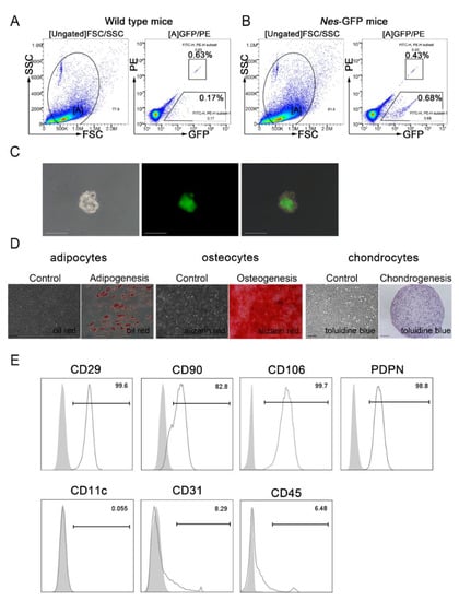 Nes-GFP+ cells derived from mouse spleens were collected as previously described []. Briefly, the spleens were minced into small pieces with 5 mL of HBSS digestive solution including Type IV collagenase and incubated in a water bath at 37 °C for 30 min. After adding DMEM containing 10% fetal bovine serum (FBS, HyClone, Logan, UT, USA) to stop digestion, the cell suspensions were centrifuged at 1250× g for 5 min at room temperature, washed twice with phosphate-buffered saline (PBS) and filtered through a 40-μm cell strainer to prepare a single-cell suspension. Nes-GFP- cells and Nes-GFP+ cells were sorted using flow cytometry (Influx, BD) and cultured in DMEM/F12 (1:1) containing 1 ng/mL LIF (Millipore, Burlington, MA, USA), 5 μg/L insulin-transferrin-sodium selenite (ITS, Sigma-Aldrich, St. Louis, MI, USA), 5% chicken embryo extract (US Biologicals, Salem, MA, USA), 0.1 mM β-mercaptoethanol (Invitrogen, Waltham, MA, USA), 1% nonessential amino acids (HyClone), 1% N2 (Invitrogen), 2% B27 (Invitrogen), 20 ng/mL bFGF (Invitrogen), and 20 ng/mL EGF (PeproTech, London, UK). These cells were kept at 37 °C in a humidified 5% CO2 water-jacketed incubator and were propagated every 3 days. Nes-GFP+ cells from similar passages were used in all assays.