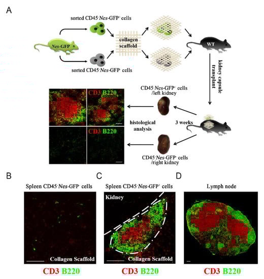 The protocol for the generation of artificial lymphoid-like structures was performed as follows: The isolated CD45-Nes-GFP− and CD45-Nes-GFP+ cells derived from mouse spleens were placed onto a collagenous matrix (CS-35; Koken, Tokyo, Japan) and squeezed several times to allow cell adsorption into the scaffold. Scaffolds containing CD45-Nes-GFP− cells were kept on ice and transplanted under one kidney capsule of anesthetized C57BL/6 mice, and CD45-Nes-GFP+ cells were transplanted under the other kidney capsule. After 3 weeks, we detected the lymphoid formation of these cells using specific antibodies against T cells (CD3) and B cells (B220). We collected the inguinal lymph nodes as lymph node controls.