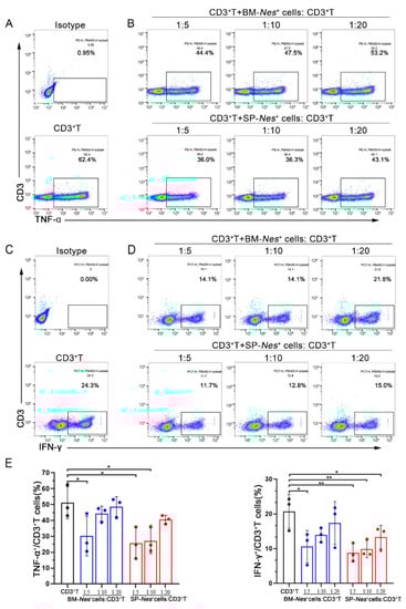 Immunosuppressive properties of Nes-GFP+ cells derived from the spleen (cytokine assay). (A,B) Nes-GFP+ cells were cocultured with sorted CD3+ T cells, and the pro-inflammatory cytokine TNF-α secretion of T cells was evaluated by flow cytometry. Representative plots of TNF-α production by T cells at different ratios. n = 3. (C,D) Nes-GFP+ cells were cocultured with sorted CD3+ T cells, and the pro-inflammatory cytokine IFN-γ secretion of T cells was evaluated by flow cytometry. Representative plots of IFN-γ production by T cells at different ratios. n = 3. (E) Bar graphs showed the inhibition rate of IFN-γ- and TNF-α-producing CD3+ T cells after coculture with Nes-GFP+ cells. Data represent mean values ± SD of three independent experiments. * p < 0.05, ** p < 0.01.