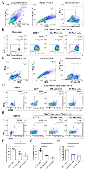 Isolated CD3+ T cells were cultured with or without Nes-GFP+ cells treated with PMA (100 ng/mL) for 24 h. The expression of CD69 and CD25 was analyzed by flow cytometry.