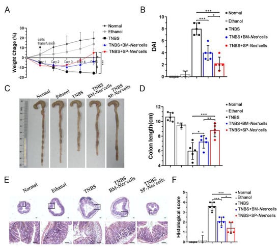 Spleen-derived Nes-GFP+ cells as a potential source for the treatment of inflammatory diseases: (A) Therapeutic efficacy evaluation of TNBS-induced IBD model, bodyweight change percentage of each group. n = 3; (B) Disease activity index (DAI) were measured. n = 5; (C) Representative colonic length of mice; (D) Quantification of the colonic length of mice. n = 5; (E,F) H&E staining and corresponding histological scoring of each group. n = 5. Scale bars, 100 μm. * p < 0.05, ** p < 0.01, *** p < 0.001.