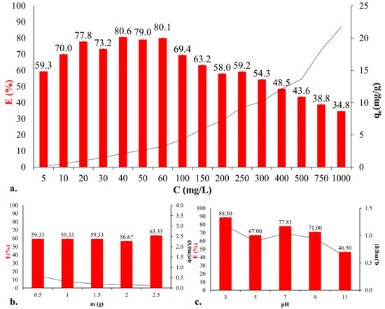 Several studies [20,21] have discussed the influence of the initial concentration of pollutants. Since the number of binding sites on the surface of an adsorbent is given, the concentration affects the rate of contaminant removal and the efficiency (E%) of binding H. In our previous review [9], we studied trends in the effects of initial concentration based on 19 studies. Three trends were observed based on the literature review: (i) when the Ci increases, the E decreases; (ii) when the Ci increases, the E increases; and (iii) the Ci does not affect the removal efficiency. In the present study, we investigated the effect of concentration over a broader range (Figure 1a). Sixteen different initial concentration values were used in the experiments, ranging from 5 to 1000 mg/L. We observed an initial increase in dye removal efficiency that reached a maximum of 80.6% at a concentration of 40 mg/L. The increase in efficiency can be explained by the fact that, at lower concentrations, more active binding sites were available for the binding of dye molecules [9]. At concentrations of 40, 50 and 60 mg/L, E was almost constant, as the active sites were saturated. After saturation, the number of binding sites was limited. The quantities in equilibrium (qe) were also studied. The qe increased with increasing concentration (qe;5 mg/L = 0.2 mg/g; qe;1000 mg/L = 21.7 mg/g).