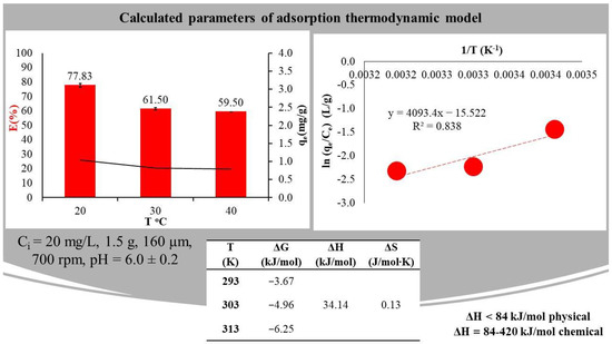 Another physico-chemical parameter that affects the determination of the optimal conditions for adsorption is temperature. In our study, both the efficiency and q decreased with increasing temperature. At 20 °C, the efficiency/quantity in equilibrium was 94.4%/1.04 mg/g, while at 30 °C, it was 92.4%/0.82 mg/g and, at 40 °C, it was 89.7%/0.79 mg/g (Figure 2). The results indicate that the sorption can be attributed to weak van der Waals and dipole forces and bonds. As the temperature increases, the thermal motion of the molecules increases, so the adsorption decreases.