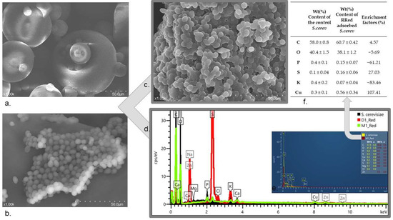The chemical composition of yeast, RR dye and the yeast sample after RR adsorption was determined with energy diffusion spectroscopy (EDS). Comparative spectra can be seen in Figure 3d,e. According to the spectra, the C, O, P, S, K and Cu elementary peaks of dye-adsorbed yeast showed different intensities compared to the control sample. The results show that the dye contained S (0.16 ± 0.06) and Cu (0.56 ± 0.34 wt%) in traces; moreover, after adsorption due to dye uptake, the yeast sample contained Cu. Based on the result of the enrichment factors (Figure 3f), the amounts of C and S increased in the sample.