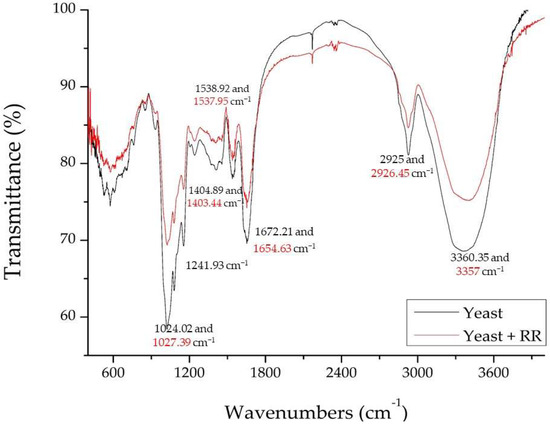 To study the mechanism of any adsorption process, Fourier-transform infrared spectroscopy (FTIR) analysis is an essential task. The adsorption mechanism of the RR dye and lyophilized yeast also requires the identification of the functional groups involved in the dye biosorption process. Therefore, we recorded FTIR spectra in the range of wavenumbers from 400 to 4000 cm−1 (Figure 4).