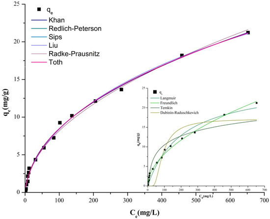 From the linearized isotherm models, we could see that our results were inconclusive. Several studies report that the linearized form has significant limitations, can negatively affect the results and can introduce error potentials, thus distorting the design of an efficient adsorption system [49]. To avoid this and to ensure the comparability of the data, error analysis and optimization techniques were used [50]. With the development of computer programs, it has become possible to fit the curves of models in order to obtain experimental data with the highest possible accuracy. In this study, the results of equilibrium data with T = 20 ± 1 °C, Ci = 5–1000 mg/L, and myeast = 1.5 g experimental conditions were examined using nonlinear curve fitting with four two-parameter (Langmuir, Freundlich, Temkin and Dubinin–Radushkevich) and six three-parameter (Liu, Toth, Kahn, Sips, Redlich–Peterson and Radke–Prausnitz) isotherm models.