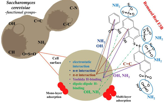 Depending on the type of interaction between the adsorbent surface and the contaminant, the biosorption process can be divided into two types: (i) chemical adsorption, an irreversible process resulting in the formation of strong chemical bonds; and (ii) physical adsorption, which is reversible and, in most cases, characterized by weak van der Waals forces, H-bonds, polarity and dipole–dipole H-bonding interactions. Furthermore, FTIR studies have demonstrated that Yoshida H-bonding, dipole–dipole H-bonding and π–π and n–π interactions can occur upon adsorption of dye molecules on yeast cells (Figure 6) [32,35,61].