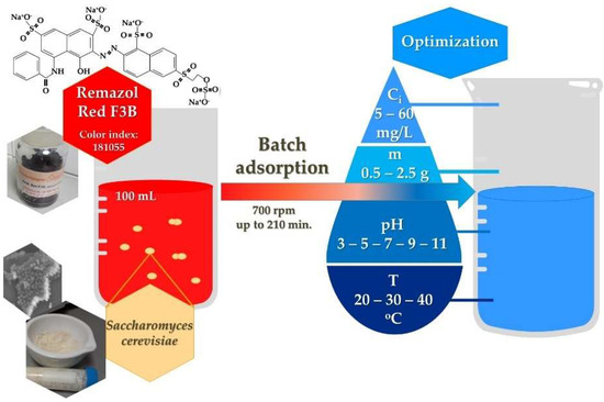 - Dilarri, G.; de Almeida, É.J.R.; Pecora, H.B.; Corso, C.R. Removal of Dye Toxicity from an Aqueous Solution Using an Industrial Strain of Saccharomyces Cerevisiae (Meyen). Water Air Soil Pollut. 2016, 227, 269. [Google Scholar] [CrossRef]