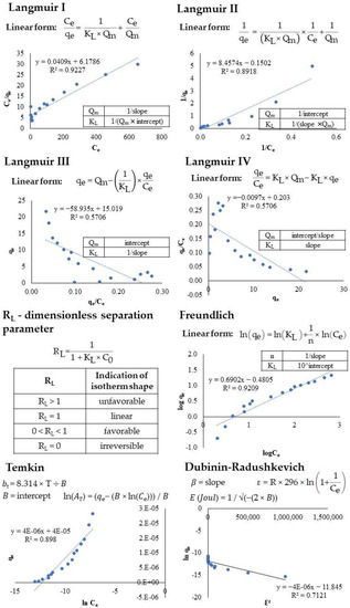 The results for the linearized isotherm models are listed in Table 1, where the linear regression coefficients (R2) of these models are compared and the models’ specific parameters are determined. The results were used to rank the best-fitting models in the following order: Langmuir I (R2 = 0.923) > Freundlich (R2 = 0.921) > Temkin (R2 = 0.898) > Langmuir II (R2 = 0.892) > Dubinin–Radukevich (R2 = 0.712) > Langmuir III (R2 = 0.571) > Langmuir IV (R2 = 0.508).