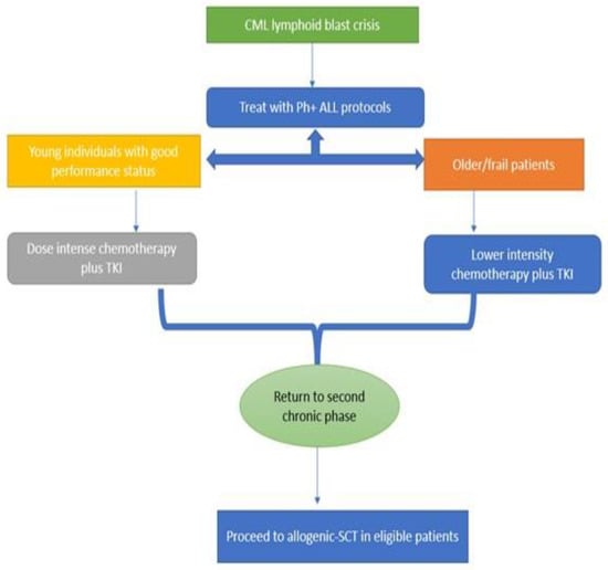 The primary objective in the management of BC is to achieve a second CP and proceed to an allogenic SCT in eligible patients. At the beginning of the early 1970s, patients were treated with acute leukemia chemotherapy protocols, and it was noted that up to one-third of the patients had a brief response to a combination of vincristine and prednisone []. The overall response rates to induction chemotherapy are around 30%, but these responses are often transient, and the median survival was only 6–8 months [,]. Building on that platform, newer antileukemic chemotherapy protocols have been combined with TKI to achieve a better response.