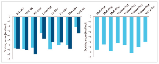 A series of enzyme-donor/acceptor substrate complexes obtained by molecular docking were evaluated based on docking score parameters (the lowest docking score parameters correspond to the most favourable position) (Figure 1). The XG-OS acceptors (Table 1) docked in the acceptor site of PttXET16A exhibited a decreasing trend in docking score parameters with the increasing galactosylation of the acceptor side XG chains [XG-OS7 (−6.79 kcal/mol) > XG-OS8 (−7.01 kcal/mol) > XG-OS9 (−7.96 kcal/mol)], while in TmXET6.3, XG-OS8 had the lowest score of −6.86 kcal/mol, followed by XG-OS7 (−6.71 kcal/mol), and XG-OS9 (−6.54 kcal/mol). The respective scores for La-OS4 and Pu-OS4 were lower for TmXET6.3 (−6.02 kcal/mol and −6.93 kcal/mol) compared to PttXET16A (−5.46 kcal/mol and -−5.35 kcal/mol). However, the respective scores with Cello-OS4, Man-OS4, and Xyl-OS4 were lower when these acceptors were docked in the acceptor site of PttXET16A (−4.66 kcal/mol, −6.78 kcal/mol, and −3.52 kcal/mol) rather than in the active site of TmXET6.3 (−3.50 kcal/mol, −6.05 kcal/mol and −2.20 kcal/mol). This finding disputed the experimentally determined activities of TmXET6.3 using these acceptors [17]. Here, the highest activity was observed with Pu-OS, followed by Cello-OS, while the lowest activity was observed with Man-OS, which had the second-best docking score parameter. The activities of PttXET16A with the latter acceptor substrates were not reported [25,35].