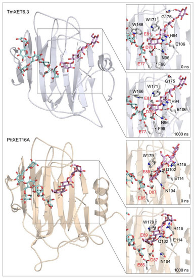 The key contributions to the clarification of substrate specificity in XETs were made through experimental measurements combined with computational investigations and bioinformatics. This was possible due to the structural knowledge resulting from the atomic structure of PttXET16A [35]. Among the most important tools are the descriptions of the recognition mechanisms of substrate-enzyme complexes that are important for enzyme design. One example of a computational approach is the exploration of the dimeric XG nonasaccharide binding using molecular dynamics (MD) simulations [24], where one of XG nonasaccharides occupied the donor site creating a stable intermediate with an enzyme while the second XG nonasaccharide occupied the acceptor site. In both PttXET16A and TmNXG1 (which is XEH; EC 3.2.1.151), the Glc moiety of the nonreducing end of the XG nonasaccharide was located closest to the catalytic residues (which occupied the donor binding site) and altered its low-energy 4C1 into the 1S3 skew-boat conformation at the beginning of the MD simulation and maintained it [24].