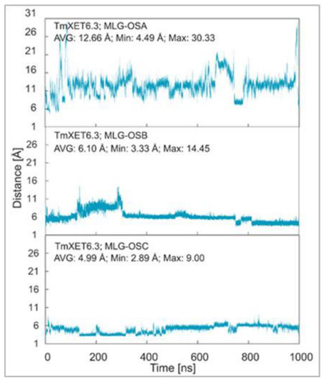 Further exploration of the instability of binding of the MLG-OS4 (A–C) acceptors in TmXET6.3 showed that the value of the binding free energy of MLG-OSA (−33.34 kcal/mol) was significantly higher compared to MLG-OSB and MLG-OSC (Table 7). The binding free energies of MLG-OSB (−42.62 kcal/mol) and MLG-OSC (−41.64 kcal/mol) were comparable, while the MLG-OSB acceptor, despite the oscillations in its position at the beginning of the MD simulation, had slightly lower energy compared to that of MLG-OSC. The noteworthy fact was that the MLG-OSB acceptor had the lowest binding free energy (that corresponded to the activity assays [17]), which was higher compared to the energies of other MLG-OS acceptors.