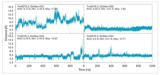 The Xyl-OS4 acceptor remained stable during the entire MD simulation in the active site of TmXET6.3 [11], with an average distance from the donor of 4.93 Å (3.52–9.16 Å) (Figure 3; RMSD values in Supplementary Figure S5). Similar to other acceptors, Xyl-OS4 displayed a declining trend in the number of interactions between the acceptor and the enzyme from the nonreducing to the reducing ends (Table 4; interactions in Supplementary Table S15). The distance of Xyl-OS4 from the donor was relatively stable in PttXET16A during the first 450 ns (Figure 3; RMSD values in Supplementary Figure S5), with an average distance of 5.97 Å (3.60–9.76 Å), whereas after this time, this distance reached an average distance of 9.70 Å [11] (3.37–17.12 Å) (cf. Supplementary Video). The Xyl-OS4 acceptor also formed only two interactions with PttXET16A (Table 4; interactions in Supplementary Table S16). Similar to Pu-OS4, both acceptors lacked reliable interactions with the donors, unlike TmXET6.3, which exhibited these interactions with all acceptors. These data are in good agreement with the predicted specificity of PttXET16-34A, and thus this enzyme should not mediate the hetero-transglycosylation reactions with Man-OS4 and Xyl-OS4.