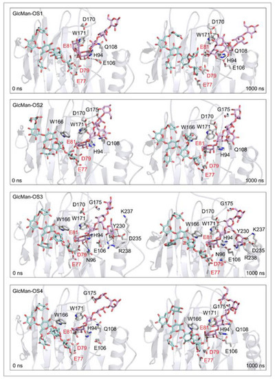 The calculated value of the binding free energy of Man-OS4 (Table 5) was lower in PttXET16A (−38.26 kcal/mol) compared to that of TmXET6.3 (−32.15 kcal/mol). However, this observation in PttXET16A resulted from a pose that was adopted during the last 200 ns—although this pose was stable, it was inappropriate for the glycosidic bond formation between the donor and acceptor substrates. Following the activity assays, the value of the binding free energy of Man-OS4 in TmXET6.3 was higher compared to that of Pu-OS4, where either the presence of a (1,6)-β-linkage or the substitution of Glc moieties for mannose led to acceptor instabilities in PttXET16A.