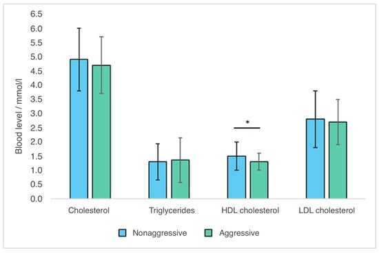 Relationship between the values of metabolic parameters and aggression in subjects with schizophrenia. Data are presented as mean ± standard deviation (SD); * p = 0.012 vs. HDL cholesterol concentration in nonaggressive subjects, Student’s t-test.