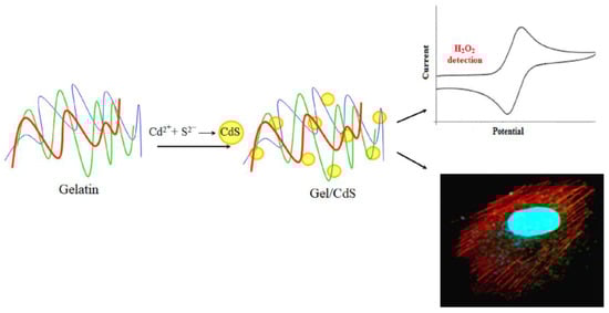 The drawback of the QDs arises from their loss in photoluminescence property due to oxidation or environmental biomolecule interaction during transportation, long-term storage and physiological environment use for bio-applications. The use of QDs for biological applications in a physiological environment interacts with the present biomolecules, salts and buffers, resulting in QDs cluster formation or precipitation. These phenomena induce negative impacts on the photoluminescence properties of QDs, which is a major drawback for its utilization. Hence, to address the above-mentioned limitations and to retain QDs photoluminescence stability, the present study has focused on developing a bio-nanohybrid system based on gelatin and semiconductor QDs. Gelatin is a biopolymer derived from collagen consisting of glycine, proline, 4-hydroxyproline and triple helix []. Gelatin solution acts as a good dispersion medium for nano-biomaterials, as metal and chalcogen ions easily penetrate into the molecular chain of gelatin [,]. Furthermore, gelatin-based nano-biomaterials have demonstrated excellent biocompatibility of the immobilized enzyme and its activity for sensor applications []. The hydrophilic domains of gelatin provide a biomimetic microenvironment for proteins, enzymes, cells and other natural substances with maintaining their native configuration, which makes gelatin a suitable matrix for small molecule entrapment. Several enzymes have been incorporated so far into a gelatin matrix, in order to develop an electrochemical biosensor []. Embedding more than one enzyme in gelatin has also been explored as a suitable strategy for biosensor fabrication []. Nanotechnology amplification processes have enhanced the intensity of the imaging signal and can lead to ultrasensitive assays [,]. The combination of biopolymer and nanotechnology provides inherent miniaturization, high sensitivity and is cost-effective for sensor and imaging technology [,]. The nanohybrid system developed in the present study was aimed to be used as an effective sensor for H2O2 detection. H2O2 is a simple compound used as an effective oxidant. It is a necessary component for the metabolism of carbohydrates, vitamins and proteins and plays a crucial role in regulating molecular signaling in biological systems [,]. In living organisms, oxidative damages in the human body are caused due to the cellular imbalance of H2O2, which is an important component for cell signaling and communication. It acts as a mediator in biology and medicine and is a byproduct generated during biochemical enzymatic oxidation of several highly selective oxidases []. Hence, it is essential to have accurate and sensitive detection of H2O2 []. There are several conventional analytical techniques employed for the detection of H2O2 such as spectrophotometry, colorimetry and titrimetric, which are complex, expensive and time-consuming. However, the electrochemical method offers an easy, sensitive and cost-effective means to detect electroactive H2O2 [].