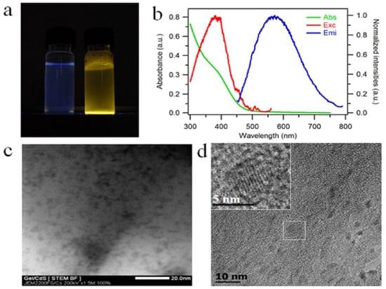 (a) Gelatin solution (left) and Gel/CdS QDs (right) under UV light (λex = 365 nm), (b) optical analysis of CdS QDs growth on gelatin aqueous solution, absorption spectrum (green line, left Y axis), excitation and emission spectra (solid lines red and blue, right Y axis), (c) STEM and (d) TEM images, inset enlargement on one particle showing lattice fringes.