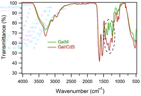 The ATR-IR spectrum (Figure 4) of the gelatin membrane (GelM) shows characteristic regions namely, amide A, amide I, amide II and amide III bands. The amide A mode consists of bands at 3324, 2935 and 2837 cm−1 that correspond to NH stretch, hydrogen bonding, and CH2 symmetrical and asymmetrical stretch, respectively. Furthermore, the amide I characteristic band observed at 1653 cm−1 is due to the triple helices and a band at 1638 cm−1 which is for random coils. The amide II region bands at 1550 cm−1 due to NH bend coupled with CN stretch, 1450 cm−1 because of CH2 bending and 1338 cm−1 for CH2 of proline. The characteristic region of amide III is composed of three characteristic bands. The band at 1168 cm−1 corresponds to an NH bending, the C–O stretch is responsible for the band at 1083 cm−1 and the band at 1034 cm−1 is related to skeletal stretches. The Gel/CdS QDs also showed a similar pattern as that of the pure gelatin with some changes in the region 1200–1500 cm−1. The changes might be due to inorganic CdS.