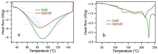 The DSC thermogram indicated the difference between the two investigated samples. The 1st heating scan (Figure 5a) shows gelatin as more hydrophilic compared to Gel/CdS QDs, in other words, the CdS QDs decreases the hydrophilicity of gelatin. The presence of the nanostructured CdS QDs helps faster evaporation of water which is evident from the shift of the relevant endothermic peak in the thermogram. The 2nd heating scan (Figure 5b) reveals a clear change in the degradation temperature of Gel/CdS QDs in comparison to GelM. This could be due to the presence of CdS which increases the thermal conductivity of the gelatin matrix, thereby degrading faster than pure gelatin.