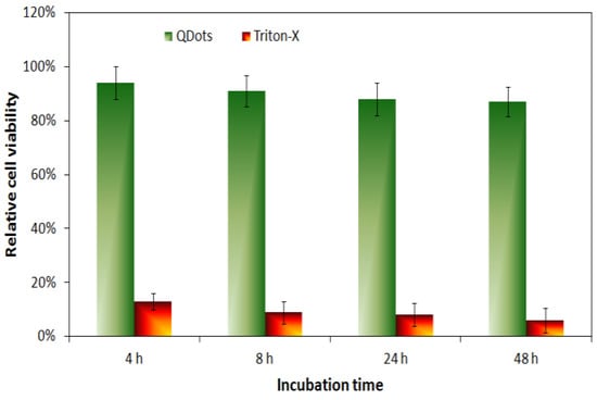 Relative cell viability of HUVEC cells exposed to Gel/CdS QDs at 5 µg/mL for 4, 8, 24 or 48 h as assessed through an Alamar blue assay.