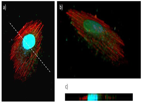 Uptake of Gel/CdS QDs (green) by HUVEC exposed for 24 h at 5 µg/mL, after which the cells were stained for actin (red) and subjected to nuclear counterstaining (blue), (a) shows a confocal slice in the middle of the cell (slice 7) revealing high levels of QDs within the cellular environment, between the actin fibers, (b) shows a 3D view of a labelled cell, consisting of a composition of 15 slices with 0.24 µm interslice distance, (c) shows a projection along the Z-axis of the 3D figure, taken along the line drawn in (a). These data reveal high levels of Gel/CdS QDs internalized by the cells.
