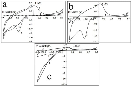 At the beginning of the first scan, the oxidation peak is absent, which can be explained by the fact that no Cd is present when the cyclic voltammogram is initiated at 0 V. As soon as the potential is directed towards more negative potentials (ca −0.34 V) and Cd is formed, the re-oxidation process appears in the next sweep of the scan. As previously reported, when CdS QDs were formed in situ in gelatin, CdS QDs as well as Cd2+ ions, are both present in the hydrated gelatin matrix. Only the Cd2+ ions give rise to the typical electrochemical behavior as shown in Figure 8a,b.
