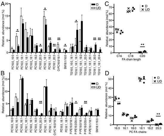 Lipidomic profiling of human urothelial cells in undifferentiated [UD] and in vitro differentiated [D] states. Plots built on LC-MS/MS profiles of lipid species with an average proportion ≥1% in either differentiation state, either for the positive ion (A) or negative ion (B) collections. In each plot, bars represent average relative proportion across 3 NHU donor backgrounds with statistical comparisons based on paired post hoc Tukey’s tests from an original 2-way ANOVA with BH-corrected significance values. (C) Glycerophospholipid fatty acyl chain length (using data from the negative ion collection only) increased significantly upon differentiation, with reductions in C16 proportions and elevations of both C18 and C20. (D) PC changes were limited upon differentiation, but these data highlight the dominant proportion of 18:1 fatty acyl chains. In (C,D), grey horizontal lines represent the average of 3 indicated NHU donor backgrounds. Significance values were generated by paired ‘t’ tests. Across all plots, ** indicates p < 0.01 and * indicates p < 0.05.