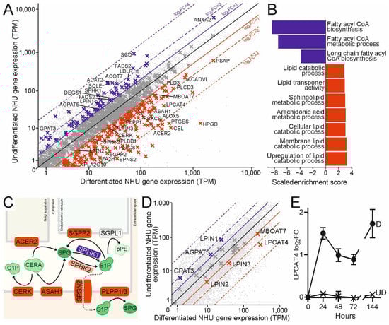 Modulation of human urothelial lipid biosynthesis induced upon differentiation. (A) Gene expression plot comparison of three donor-matched cultures before [UD] and after [D] induction of the NHU differentiation protocol. Genes with gene ontology terms linked to lipid processing are shown as crosses, otherwise dots. Red crosses exhibit greater than doubling of expression in the differentiated cultures, and vice versa for the blue crosses, when corrected p values were less than 0.05. Genes of particular interest are indicated. (B) Lipid pathways enriched in differentiated (red) or undifferentiated (blue) states. Scaled enrichment score is equal to the GSEA normalised enrichment score multiplied by the reciprocal of the FDR. (C) Urothelial “sphingolipid rheostat” showing the upregulation of gene transcript upon differentiation where protein products deplete ceramide (CERA) or sphingosine-1-phosphate (S1P), likely increasing sphingosine (SPG) levels. Upregulated genes in red, downregulated in blue, partial upregulation in pink, no significant change in grey. Changing genes are named in (A). Metabolites in green. C1P: ceramide-1-phosphate; pPE: phosphoethanolamine. ACER2 hydrolysis of ceramides commonly produces sphingosine and stearic acid (18:0); the latter may explain the slight increase in 18:0 PC fatty acyl chains seen upon differentiation (Figure 1D). (D) Same as the expression plot in (A) but highlighting genes from the Kennedy Pathway or Land’s Cycle only, naming those with statistically significant changes, highlighting the 5.37-fold upregulation of LPCAT4 upon differentiation (Benjamini-Hochberg corrected p = 4.76 × 10−6). (E) RT-qPCR timecourse of LPCAT4 expression upon differentiation [D] with values normalised to the undifferentiated [UD] 0 h levels. Error bars represent standard deviation from three technical replicates of a single NHU donor background.