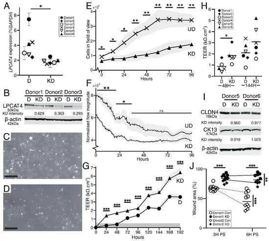 Characterisation of the LPCAT4 knockdown [KD] cell lines compared to control undifferentiated [UD] or differentiated [D] cells. Donors exhibited variation in LPCAT4 native expression as well as knockdown efficiency (A), but transcript-level knockdown was observed in all lines to an average of 50%. Similar knockdown was observed at the protein level (B). Transduced control cells (C) grew well, but matched LPCAT4 knockdown cultures (D) showed reduced population size after 9 days under transgene-selective conditions. Scale bars equal 200 μm. Reduced proliferation (E) and motility (normalised velocity assessed by optical flow) (F) were confirmed quantitatively using timelapse imaging. A significant difference in population size was even observed following the overnight acclimatising period from identical seeding densities, before recording began (0 h) (E). LPCAT4 knockdown cultures consistently generated elevated ‘tighter’ electrophysical epithelial barriers (G). Again, donor NHU backgrounds exhibited barrier variance with and without knockdown, but the barrier was significantly elevated across all six donors at both early (48 h) and late (144 h) differentiation time points (H). Knockdown did not appear to impact NHU differentiation on western blots for either early (CK13) or later (CLDN4) markers (I). LPCAT4 knockdown resulted in slower wound restitution after scratch wounding (J), but all wounds were eventually resolved. In (A), error bars for each donor represent the 95% confidence interval from all combinations of GAPDH and LPCAT4 technical replicates. In (E–G) shaded regions represent the standard deviation range around the mean line, with time-matched pairwise statistical significance indicated. *** is p < 0.001, ** is p < 0.01, and * is p < 0.05 across all plots. In (F), measurements were taken every 30 min, so statistical significance is represented by regions of significance based on the average p value from a 3-comparison sliding window. Wound area and closure rate was assessed using the Hoechst 33258 images, with five technical repeats by random field selection.