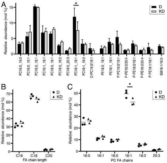 Impact of LPCAT4 knockdown [KD] on the lipidomic profile of in vitro differentiated [D] human urothelial cells. (A) LC-MS/MS negative ion profile of lipid species with an average proportion ≥1% in either condition, highlighting the only significant difference in PC 18:1_18:1 molecules. Bars represent average relative proportion across 3 NHU transduced donor backgrounds (donors 1, 3 and 4; Figure 3) with statistical comparisons based on paired post hoc Tukey’s tests from an original 2-way ANOVA with BH-corrected significance values. (B) Glycerophospholipid fatty acyl chain length does not show significant differences upon knockdown, but monounsaturated C18 use in PC is significantly reduced upon LPCAT4 knockdown (C). In (B,C), grey horizontal lines represent the average of 3 independent NHU donor backgrounds. Significance values were generated by paired ‘t’ tests, with * indicating p < 0.05.