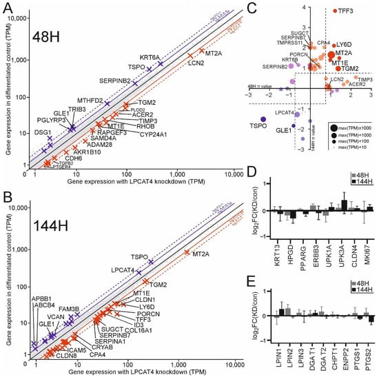 Specific transcriptomic effects of LPCAT4 knockdown. Gene expression plot for 4 donor-matched knockdown and control cultures 48H (A) and 144H (B) after initiation of the NHU differentiation protocol. Genes upregulated following LPCAT4 knockdown are indicated by red crosses and named when expression increases by at least 50% with a corrected p value less than 0.05 (two targets with smaller font are of interest have corrected p values less than 0.10). Genes downregulated by at least 50% with a corrected p value less than 0.05 are marked by blue crosses. Consistent transcriptomic changes between time points are indicated in (C) using π scores and scaled points based on maximum expression values. Bright red and blue indicate significant changes at both time points, transparencies represent significance at one time point. Pink circles represent genes where the fold-change direction switched between time points. There were no significant differences in differentiation markers at either time point (D), or in genes of lipid modifiers perhaps impacted by the reduction in LPCAT4 metabolic activity (E). Transduced donor backgrounds 1–4 (Figure 3 and Figure 4) were used for transcriptomic analysis.