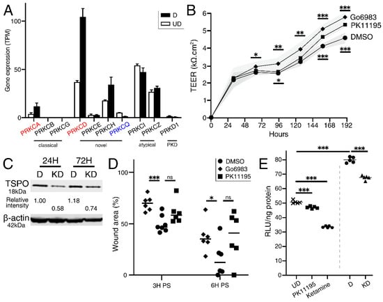 Phenocopying of the LPCAT4 knockdown by independent inhibition of PKC and TSPO activity. (A) Expression of PRKCD is most abundant PKC gene in differentiated NHU cells, and significantly (by fold change and statistically) upregulated upon differentiation (red text; blue text for downregulated upon differentiation; data as described in Figure 2A). Classical PKC isozymes (DAG- and calcium-dependent) are less abundant. PKD (historically PKC-μ) shown for reference. (B) Inhibition of eitherpan-PKC (Go6983; significance indicated above trend lines) or TSPO (PK11195; significance indicated below trend lines) activity led to elevated urothelial barrier resistance. TEER values based on 6 technical replicates per condition per time point, with standard deviation represented as shaded areas around mean values. TSPO protein reduction in an LPCAT4 knockdown environment was validated by western blotting (C) at 24 and 72-h after differentiation induction. Inhibition of PKC delayed wound healing (D), but high variance was observed with PK11195-treated cultures. (E) In proliferative conditions (left of dashed line), PK11195 treatment reduced NHU endogenous ATP availability by 6.9% (p = 1.82 × 10−4), with ketamine a strong positive control, as reported previously []. Upon differentiation (right of dashed line) endogenous ATP availability increased by 57.7% (p = 2.00 × 10−9). LPCAT4 knockdown significantly reduced ATP availability by 15.7% (p = 3.82 × 10−6). Endogenous ATP fluorescence values from 5 technical replicates normalised by background blank cultures and total ng of protein. Across the figure, significance values were generated by independent ‘t’ tests, with * indicating p < 0.05, ** indicating p < 0.01, and *** indicating p < 0.001.