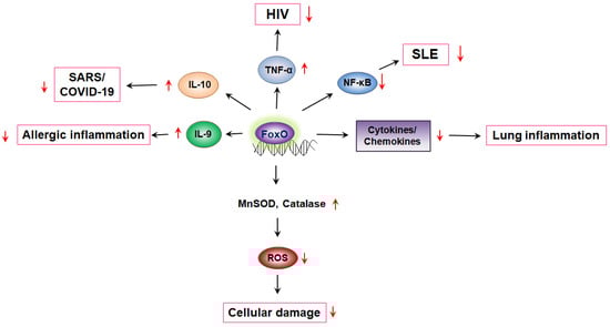 FoxO-mediated cytokine production regulates diseases. FoxO, Forkhead transcription factor O; MnSOD, manganese superoxide dismutase; ROS, reactive oxygen species; NF-κB, nuclear factor kappa B; SLE, systemic lupus erythematosus; TNFα, tumor necrosis factor alpha; HIV, human immunodeficiency virus; SARS, severe acute respiratory syndrome.