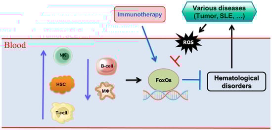 Various cell types involved in hematological disorders through FoxO transcription factors. T-cell, T lymphocyte; B-cells, B lymphocytes; NK cells, natural killer cells; HSCs, hematopoietic stem cells; MΦ, macrophages, ROS, reactive oxygen species.