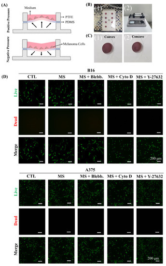 To provide cyclic straining on melanoma cells, a cell culture system was designed and prepared. As in the illustration of the cell culture system shown in Figure 1A, melanoma cells were seeded on flexible PDMS film. With a pressure change in the bottom cavity, the PDMS film presented cyclic concave and convex deformation (Figure 1B and Video S1). Indeed, the cyclic straining on melanoma cells was provided by the tensile deformation of PDMS. Eight units were designed and prepared in the PTFE panel for parallel experiments. In addition, the bottom cavity of each unit was connected to a double-channel syringe pump to obtain the pressure change. After melanoma cells were treated with cyclic straining and inhibitors for 24 h, their cell viability was characterized. As shown in Figure 1B, cyclic straining, belbbistatin, Y-27632, and cytochalasin D had no significant influence on cell viability and were suitable for further experiments.