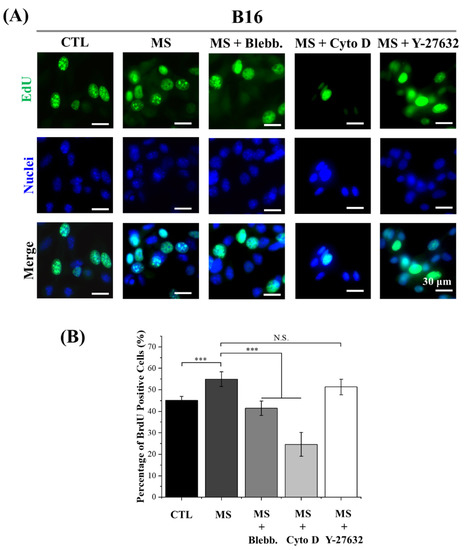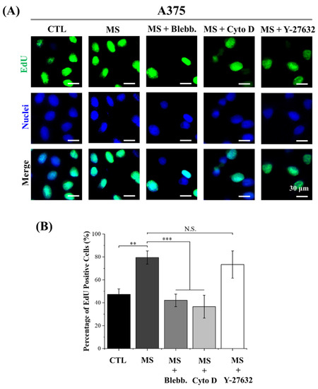 After melanoma cells were stimulated for 72 h, the proliferation of melanoma cells was assessed. In the results, the number of mechanically stimulated (MS) melanoma cells was higher than the cells without mechanical stimuli (Figure 2B). Based on previous evidence, extracellular biophysical stimuli are converted into electrochemical signals through mechanotransduction by regulating cytoskeleton-associated morphogenesis [32]. In this case, both myosin and actin polymerization were inhibited to explore the role of cytoskeleton organization in the mechanosensing of cyclic straining. As shown in Figure 2B, with the treatments of myosin inhibitor blebbistatin and actin polymerization inhibitor cytochalasin D, the amount of proliferated melanoma cells was significantly decreased (Figure 2B). In addition, in a comprehensive analysis of the inhibitor-treated proliferation results without mechanical stimulation, the positive effect of cyclic straining disappeared after myosin and actin polymerization inhibitor treatments (Figure S1). Consequently, the cytoskeleton, including myosin and actin filaments, was indicated as a critical regulator in sensing cyclic straining. Furthermore, the critical role of the ROCK signaling pathway in the regulation of actomyosin contraction and stress fiber formation has been revealed by previous research [33]. Therefore, Y-27632 was also applied to investigate the role of the ROCK signaling pathway in sensing cyclic straining. As a result, after the treatment of Y-27632, the amount of proliferated melanoma cells was increased but independent of mechanical stimuli (Figure 2B). According to a previous report, Y-27632 was able to promote BRAF-mutated melanoma cell proliferation through the activation of AKT and ERK [34]. Additionally, the enhanced proliferation ability of melanoma cells after Y-27632 treatment was independent of mechanical stimuli. These results indicated that Y-27632-activated proliferation was independent of mechanotransduction in sensing cyclic straining.