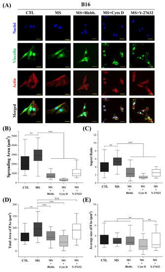 Influence of cyclic straining and inhibitors on the morphogenesis of A375 cells. (A) Representative fluorescent images of actin, vinculin, and nuclei-stained A375 cells. (B) Spreading area of B16 cells (n > 30). (C) Aspect ratio of A375 cells (n > 30). (D) Total size of focal adhesions in A375 cells. (n > 30). (E) Average size of focal adhesions in B16 cells (n > 30). ** p < 0.01, *** p < 0.001, N.S.: Not Significant.