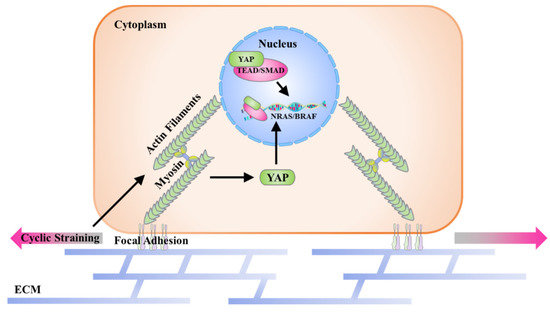 In summary, the localization of YAP and the expression of melanoma-associated mutated genes were regulated by cyclic straining and cytoskeleton inhibitors. The results of YAP positioning demonstrated that the YAP-associated mechanotransduction pathway was activated during the cyclic straining treatment. In addition, the regulatory gene expression also indicated the potential relationship between the mechanotransduction pathway and melanoma progression.